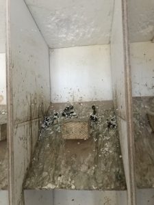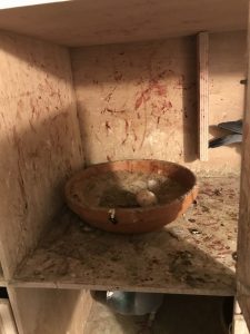 Toen ik op een gegeven moment in het hok kwam schrok ik mij een hoedje een broedhok was helemaal rood van het bloed. De doffer zijn borst was helemaal vies van het bloed en de bodem ook. Ik zag verder niets aan de duiven. Ik denk dat de duivin met haar nagel iets geraakt heeft wat is gaan bloeden. Toen ik ze aan het eind van de middag weer ging scheiden was er aan de doffer al haast niets meer te zien. Toen de doffers buiten waren maar even zijn broedhok schoongemaakt.