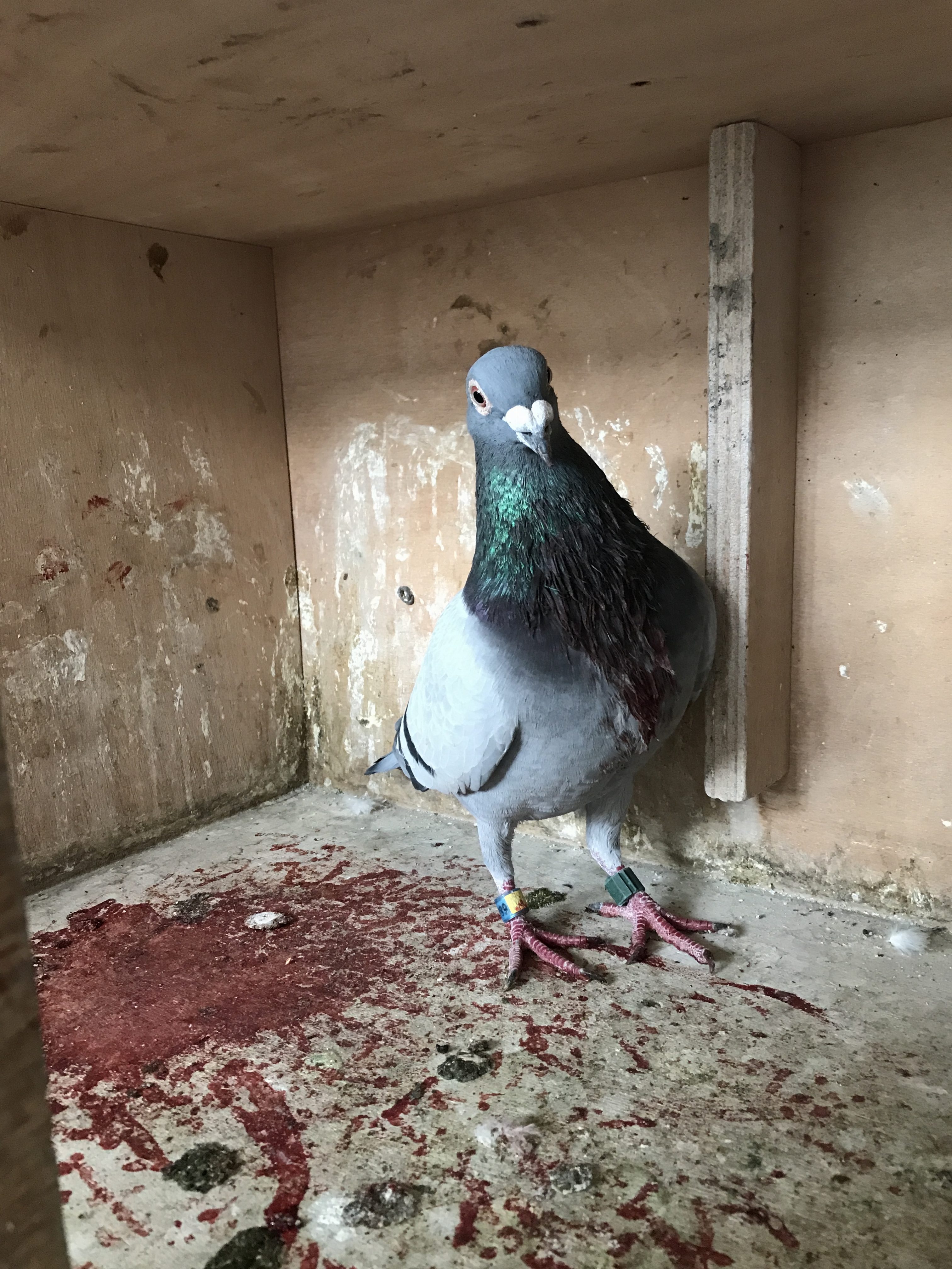 Toen ik op een gegeven moment in het hok kwam schrok ik mij een hoedje een broedhok was helemaal rood van het bloed. De doffer zijn borst was helemaal vies van het bloed en de bodem ook. Ik zag verder niets aan de duiven. Ik denk dat de duivin met haar nagel iets geraakt heeft wat is gaan bloeden. Toen ik ze aan het eind van de middag weer ging scheiden was er aan de doffer al haast niets meer te zien. Toen de doffers buiten waren maar even zijn broedhok schoongemaakt.