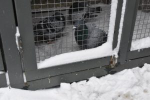 Vanwege het pak sneeuw de hele week geen duiven los gehad. Alleen op zaterdagmorgen vloog er per ongeluk bij het opendoen van de deur een duivin naar buiten. Ze vond het maar niets buiten en was snel weer binnen. Later is wel het koppel in het duivinnenhok voor het eerst dit jaar even buiten geweest.