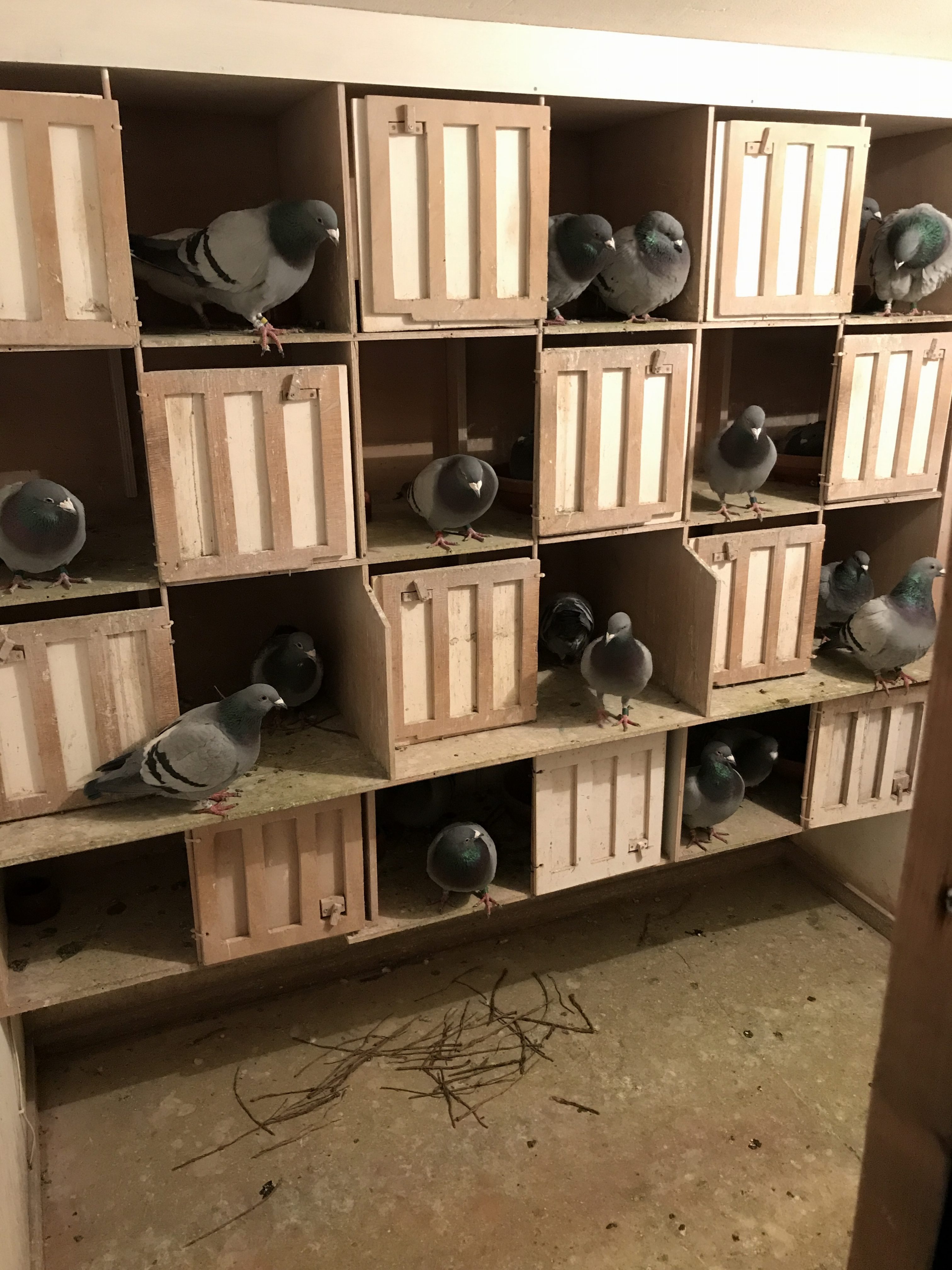Afgelopen woensdag heeft Bert zijn zeven kweekkoppels gekoppeld. Een dag later op donderdag heb ik in het weduwnaarshok 12 koppels samen gezet. In het duivinnenhok zit een koppel op de grond. Later zal deze doffer op een schabje bij de weduwnaars geplaatst worden. De doffer die in eerste instantie aangezien werd als duivin zit nog in het jonge duivenhok, ik weet nog niet wat ik met hem ga doen. De koppels waren vrijwel gelijk aangelopen en `s avonds ben ik al begonnen met koppels loslaten. Op vrijdag had ik een halve dag vrij genomen om de koppels te wennen. Elke 25 minuten liet ik een ander koppel los. Dit ging allemaal redelijk goed en aan het eind van de dag liet ik al meerdere koppels gelijk los. Op zaterdag hier ook de hele dag mee bezig geweest. Maar aan het eind van de middag had ik alles los op het hok en zonder vechtpartijen. Ook in de nacht de gok genomen om alles los op het hok te laten. Toen ik op zondagmorgen beneden kwam ging alles nog steeds goed en waren alle tabakstelen die ik op de grond had leggen al weggesleept. In de loop van de dag zijn er aardig wat tabakstelen versleept en hebben sommige koppels al een aardig nest gebouwd.