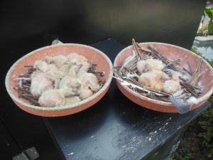 Verder gaat alles prima bij de oude. De twee grootte jongen die nog bij een koppel liggen zijn nagenoeg helemaal wit. Zij kunnen ongeveer komende woensdag gespeend worden. Bij het koppel wat nog op eieren zat zijn de jongen gisteren uitgekomen. Wanneer de twee witte jongen gespeend worden gaat ook hun moeder gelijk naar het weduwduivinnenhok. Het andere koppel zal nog een paar weken bij elkaar blijven.