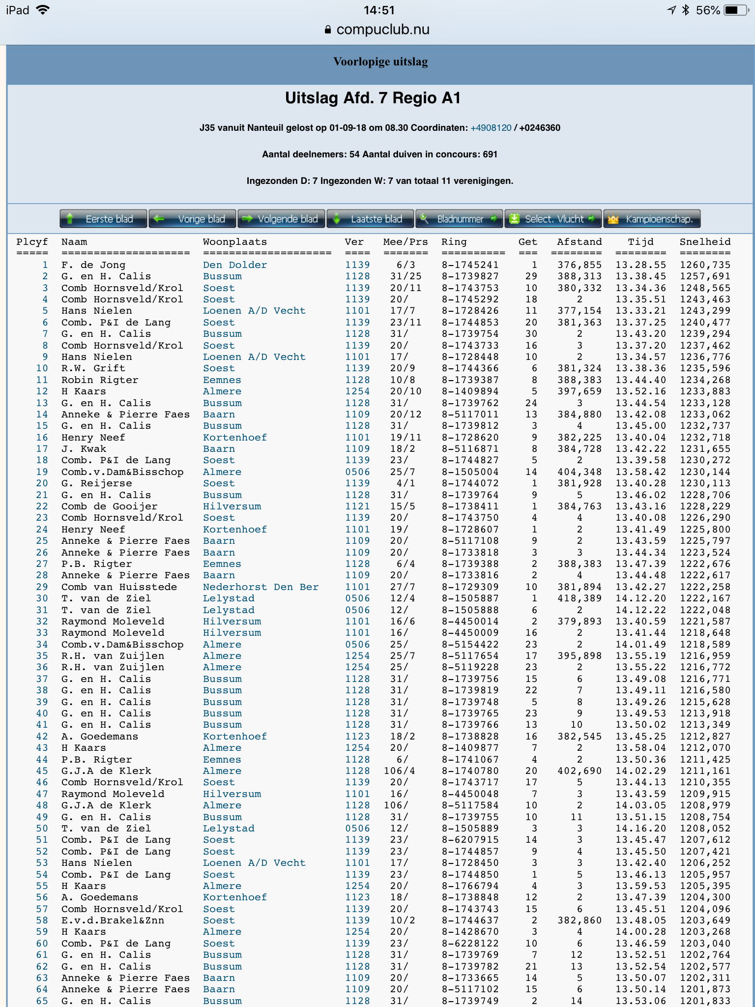 Haar kleine jong had haar enorm gemotiveerd. Het verbaasde mij echter dat juist deze duif als eerste arriveerde. Ze had tot nu toen nog niets gepresteerd. Ook een minuut later mijn tweede duif was een verrassing. Dit was het duivinnetje waar van het ei woensdag stuk op de grond lag. Ook zij had alleen een 17 in de club gespeeld hiervoor. Aangenomen werd dat dit geen hele vroege duiven konden wezen. De verrassing was echter groot toen later bleek dat ik 1 en 2 in de club speel en in de regio A1 afd 7 werd dit plaats 5 en 9 tegen 691 duiven. Zie ver uitslag, zie regio uitslag. Op de club kreeg ik van de grootste concurrent Henny Neef een flesje wijn als felicitatie voor de overwinning.