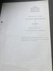 Tussen de documenten kwam ik de oprichting akte tegen van de huidige regio Hilversum e.o. Deze kring is in 1965 opgericht onder de naam “Stichting tot bevordering van de postduivensport voor Hilversum en omstreken”. Deze hebben wij waarschijnlijk gekregen toen wij weer lid geworden zijn bij afdeling 7 en mee gingen spelen met de kring Hilversum. In het document staat mijn oude vereniging uit Vreeland echter ook al als medeoprichter van de stichting wat toen onderdeel was van afdeling Gooi en Sticht. Een leuk historisch document.