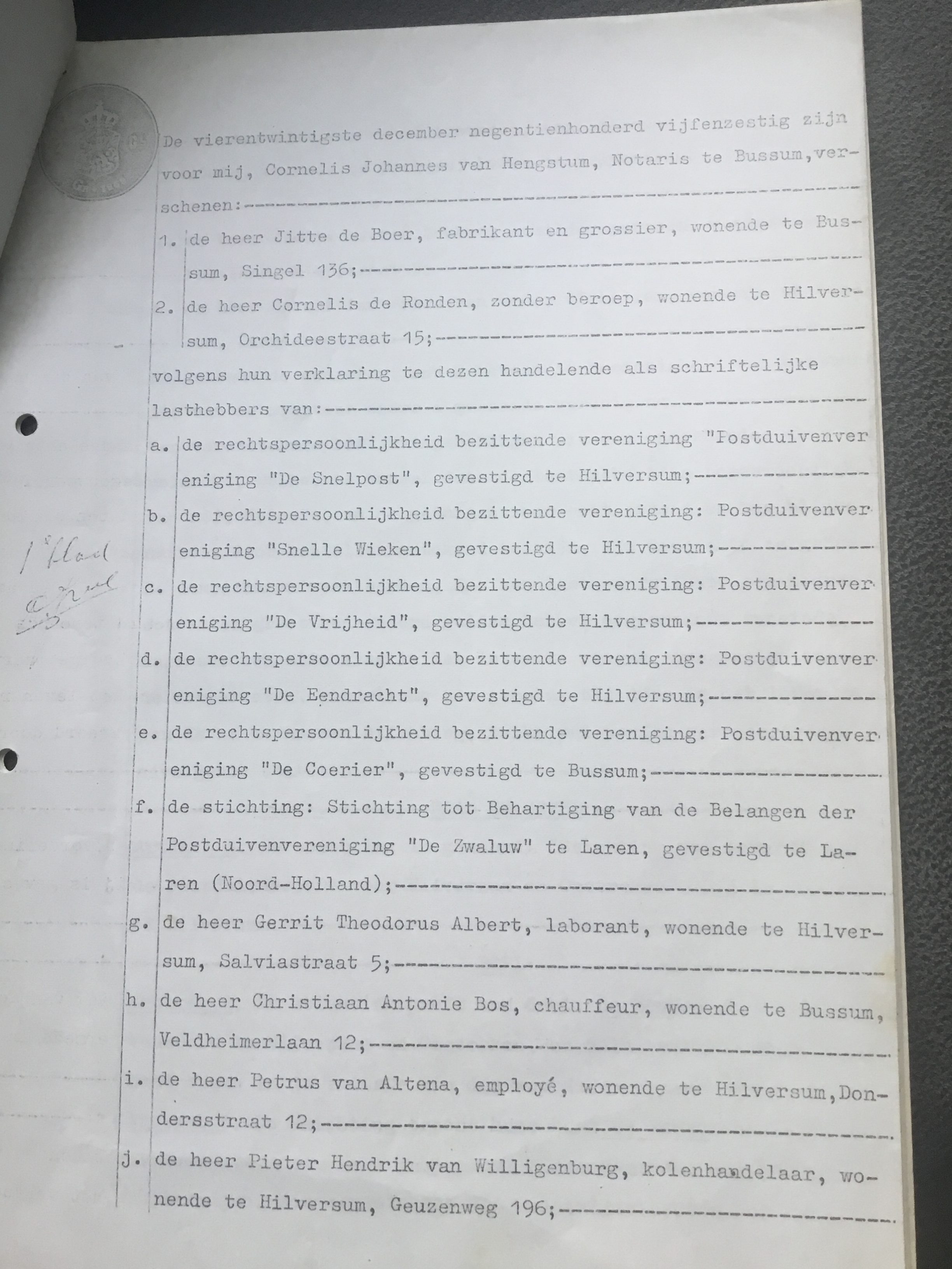 Tussen de documenten kwam ik de oprichting akte tegen van de huidige regio Hilversum e.o. Deze kring is in 1965 opgericht onder de naam “Stichting tot bevordering van de postduivensport voor Hilversum en omstreken”. Deze hebben wij waarschijnlijk gekregen toen wij weer lid geworden zijn bij afdeling 7 en mee gingen spelen met de kring Hilversum. In het document staat mijn oude vereniging uit Vreeland echter ook al als medeoprichter van de stichting wat toen onderdeel was van afdeling Gooi en Sticht. Een leuk historisch document.